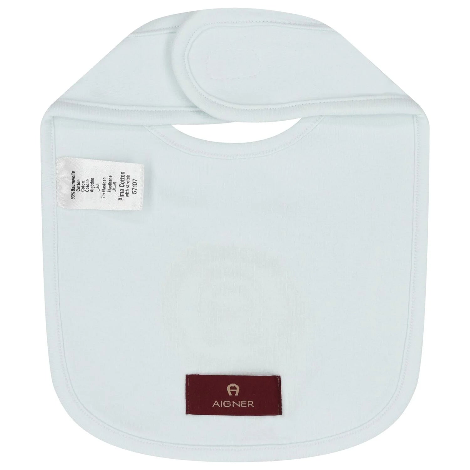 Blue baby bib for baby boys by Aigner, made from soft cotton jersey for gentle comfort. This adorable accessory is embroidered on the front with the brand's iconic horseshoe and logo in shimmering gold thread, adding a touch of luxury to everyday essentials. It fastens easily with Velcro at the back for a secure fit. Matching items are available to purchase separately.
