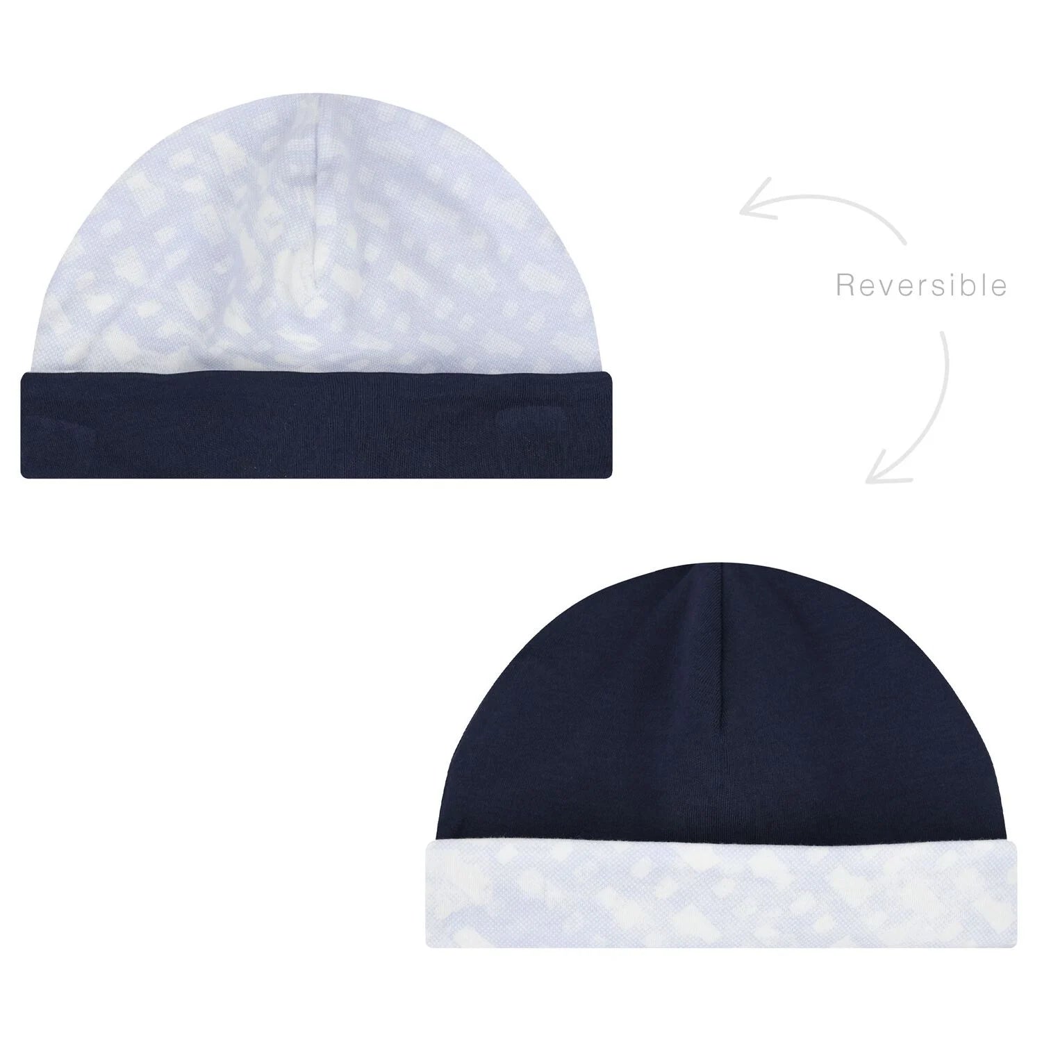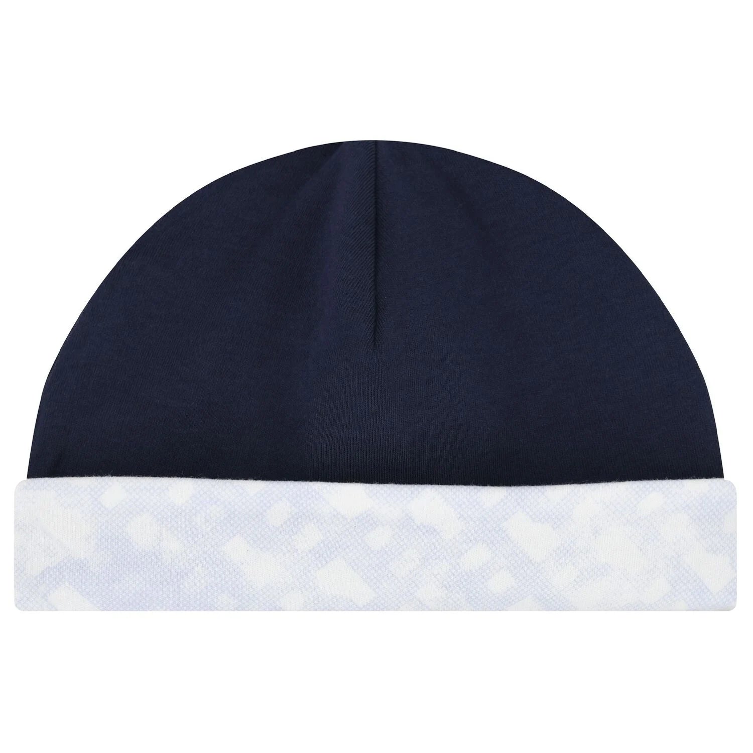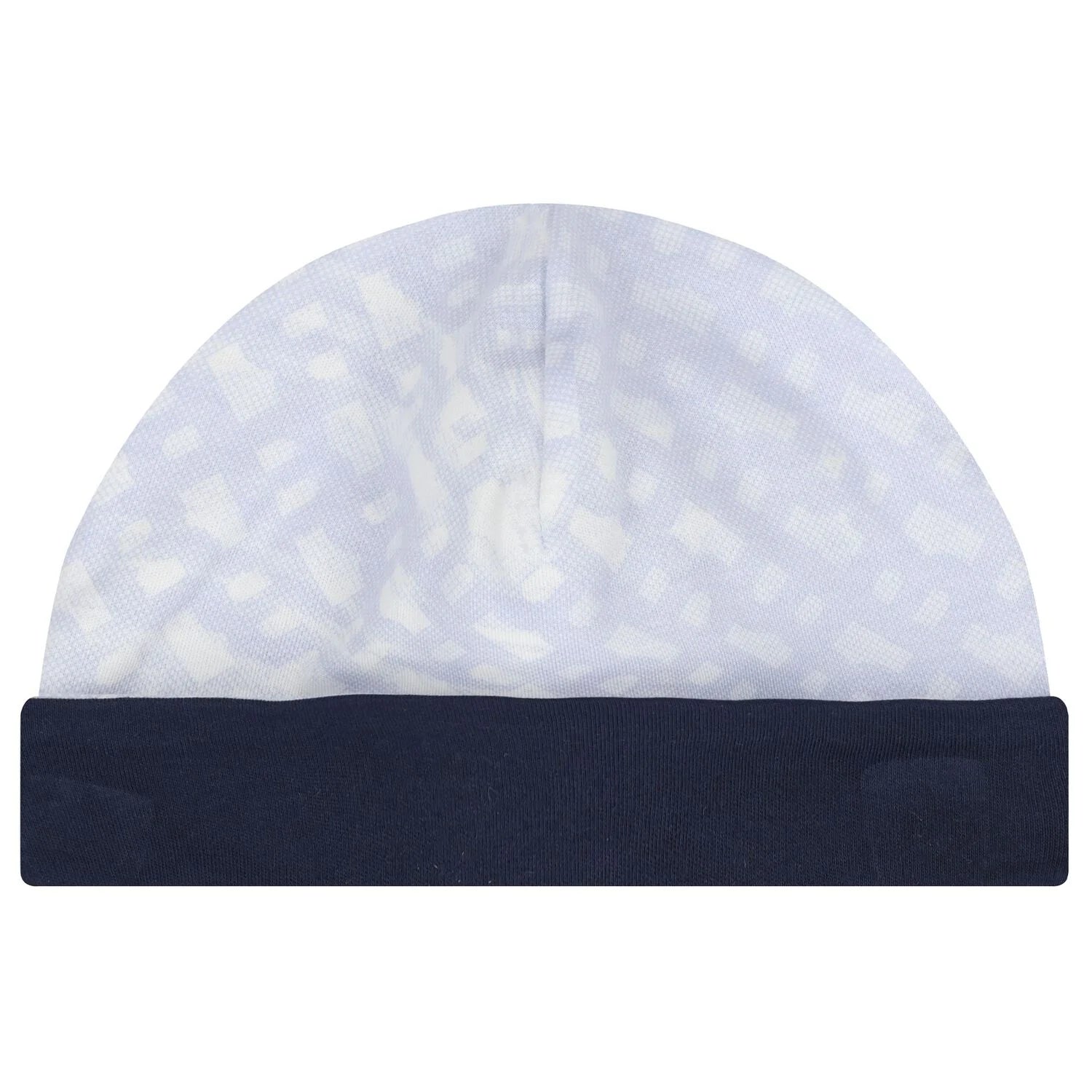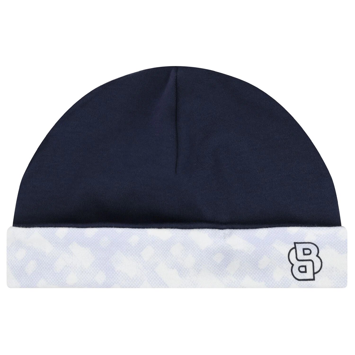 Blue babygrow gift set for baby boys by BOSS. Made from soft cotton with a monogram logo print pattern, the set includes a babygrow with poppers fastening on the front for easy dressing. The matching reversible hat features the monogram logo on the turn-up brim, and the bib fastens at the back with a popper. Matching items are available to purchase separately.