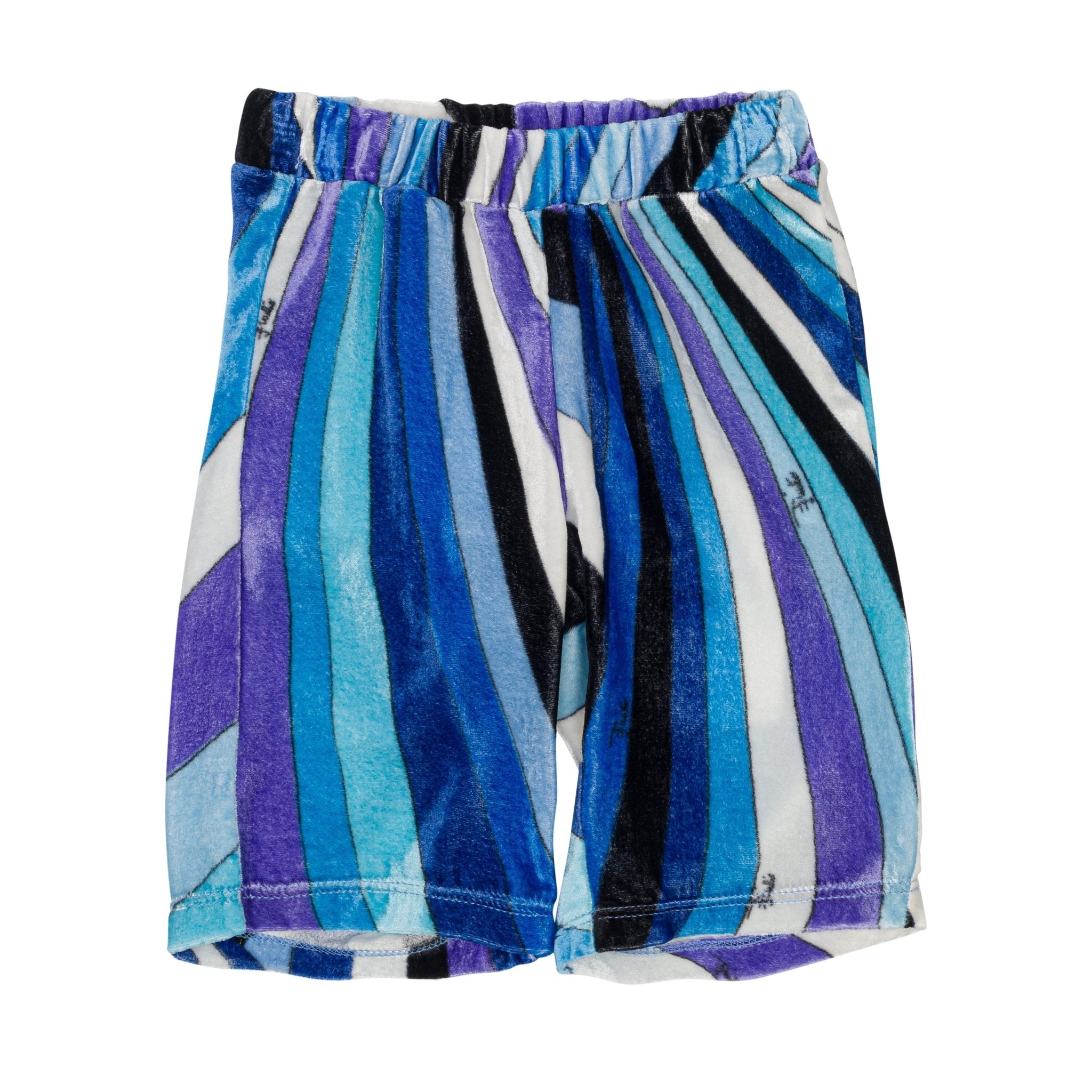 • A small garment, a big visual impact. These soft velvet pants envelop little ones in playful, refined energy. The Iride print, in enveloping shades of ivory and blue, creates fluid, chromatically vibrant movements, evoking the imagination and freedom typical of the Pucci universe. The fabric provides a feeling of warmth and comfort, while the elastic waist ensures practicality and a perfect fit for any time of day.