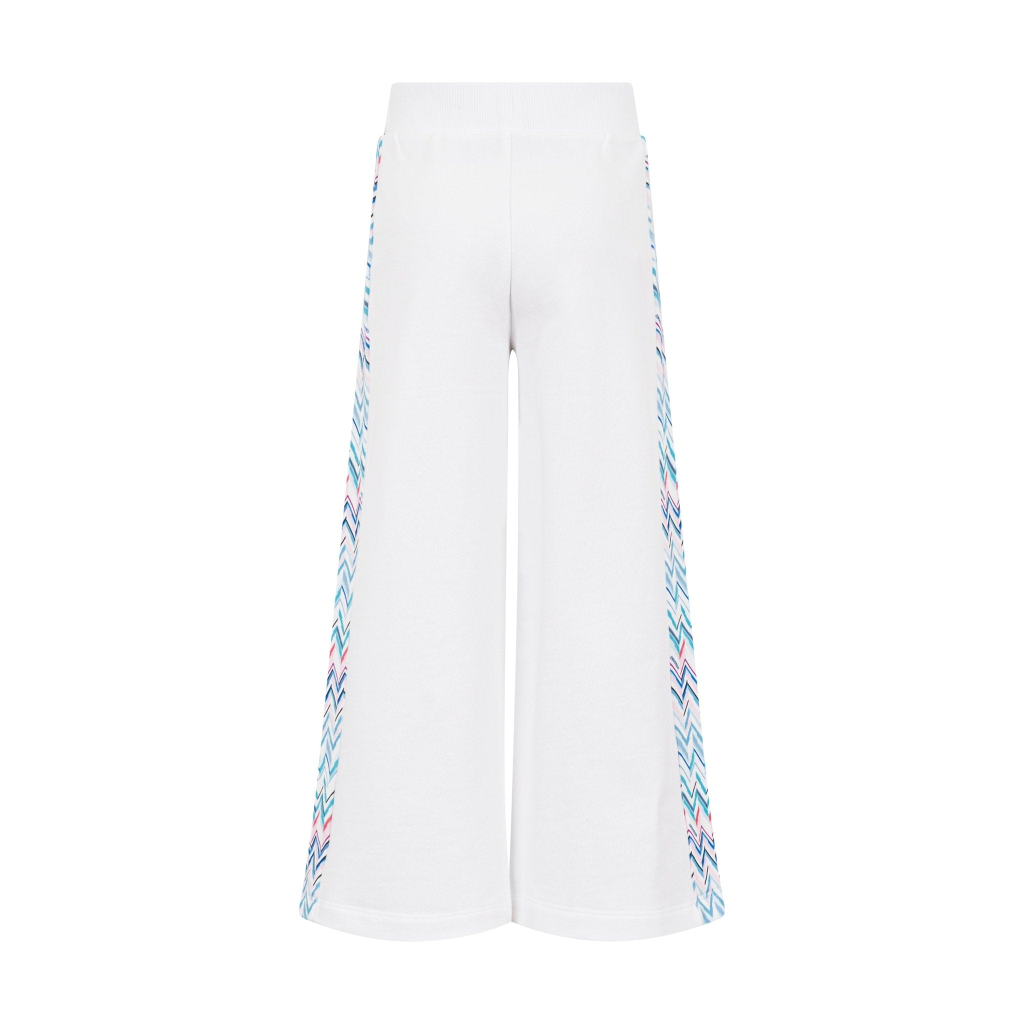 White joggers for girls by luxury Italian fashion house Missoni, made in soft, mid-weight cotton jersey. Cool and casual, they are styled with a wide leg, concealed front pockets and an elasticated waistband for comfortable wear. The sides are trimmed with the brand's signature zigzag pattern in a pretty blue and pink colourway for a statement finish.