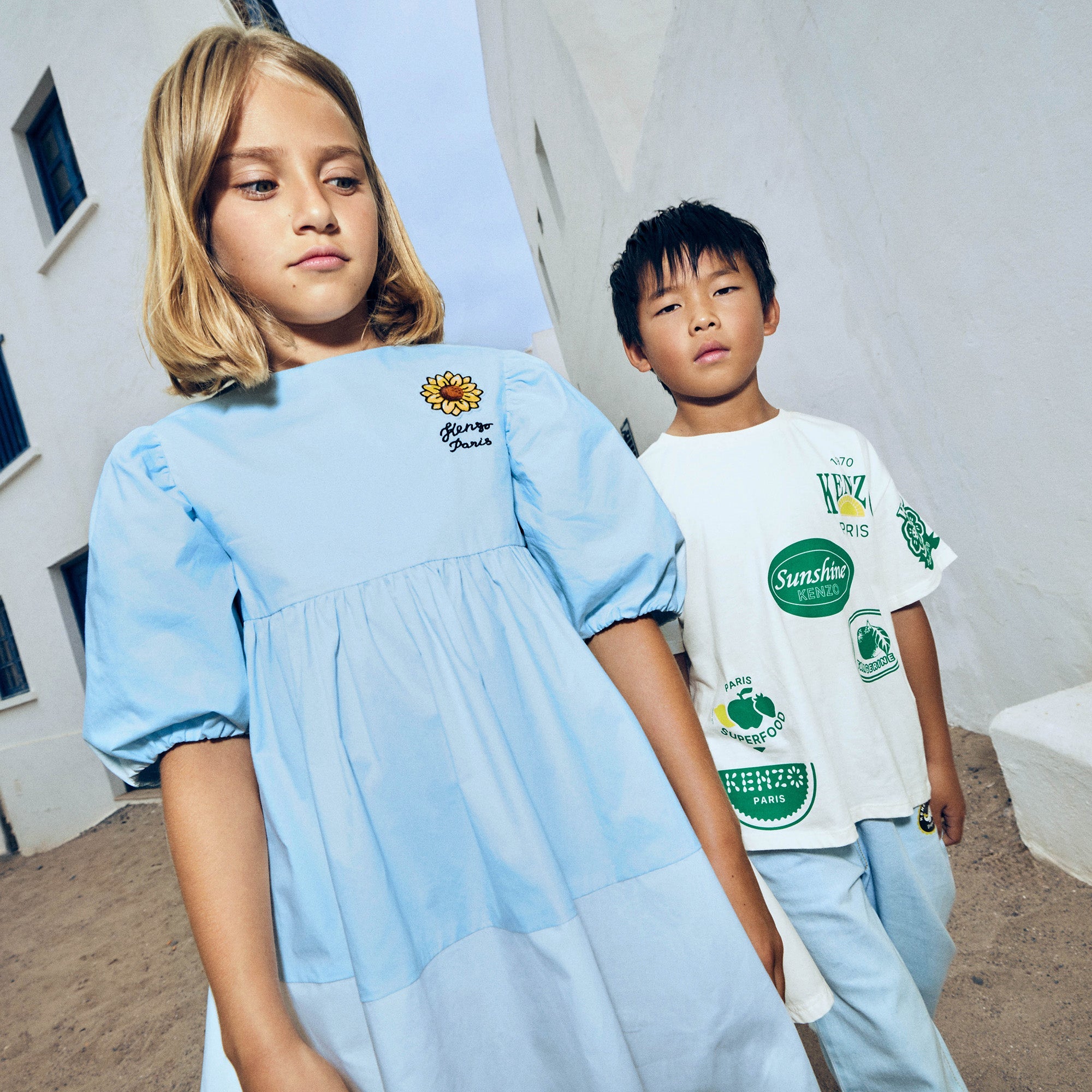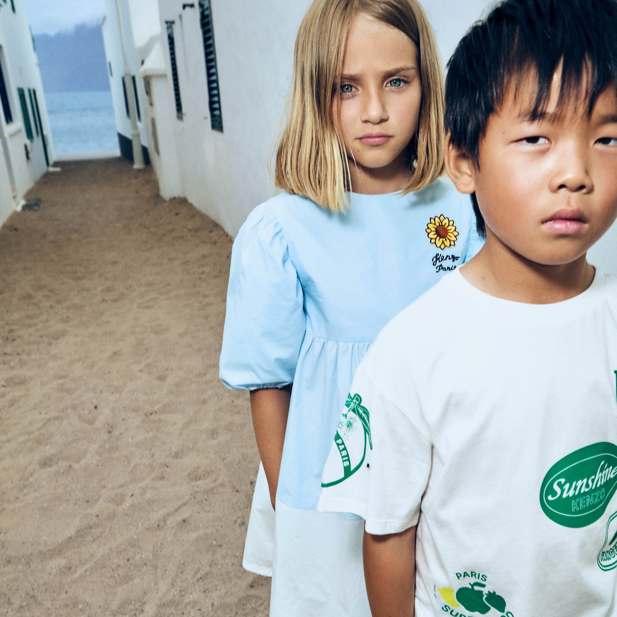 Ivory organic cotton T-shirt for boys by KENZO KIDS, with an eye-catching logo and fruit sticker print in green and yellow. Great for casual days, it has a relaxed fit and is made in soft, comfortable jersey.