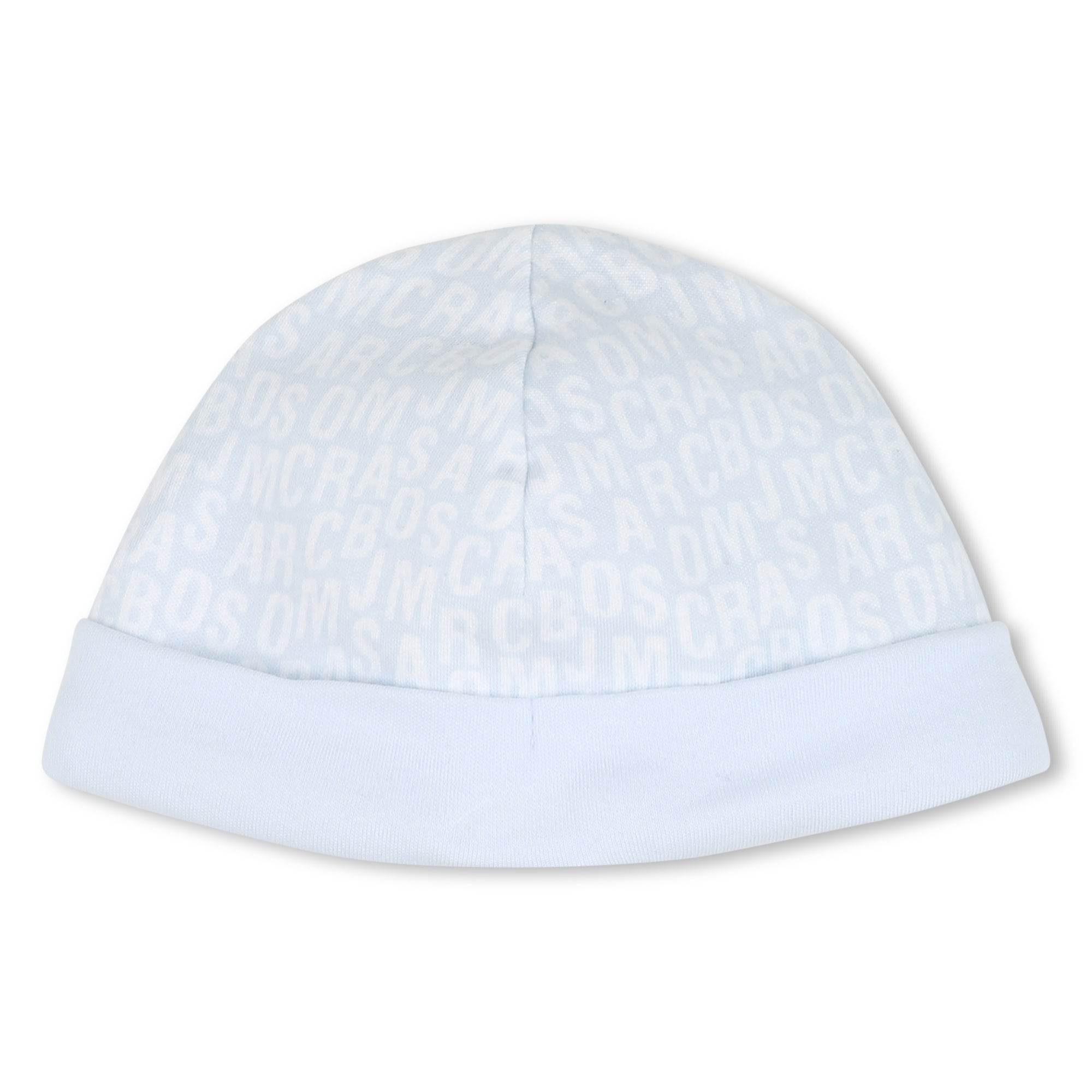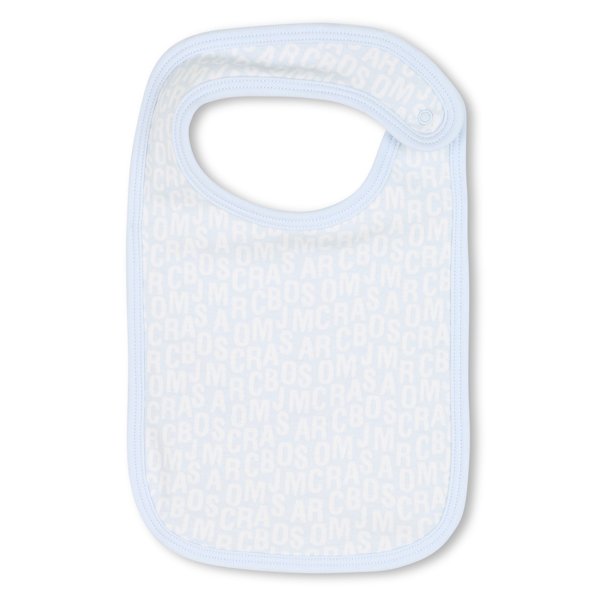 Pale blue and white babygrow gift set for baby boys. Made from soft cotton with jumbled logo print pattern, the set includes a babygrow with popper fastenings, a matching layette hat, and a towelling-back bib. Comes in a branded gift box.