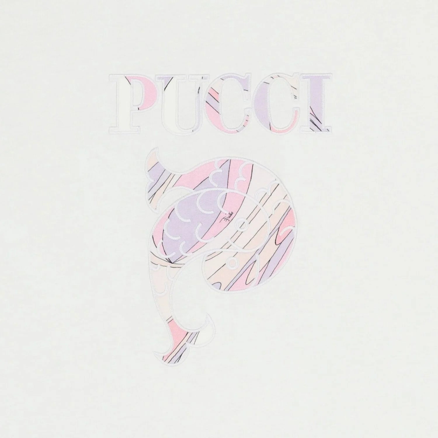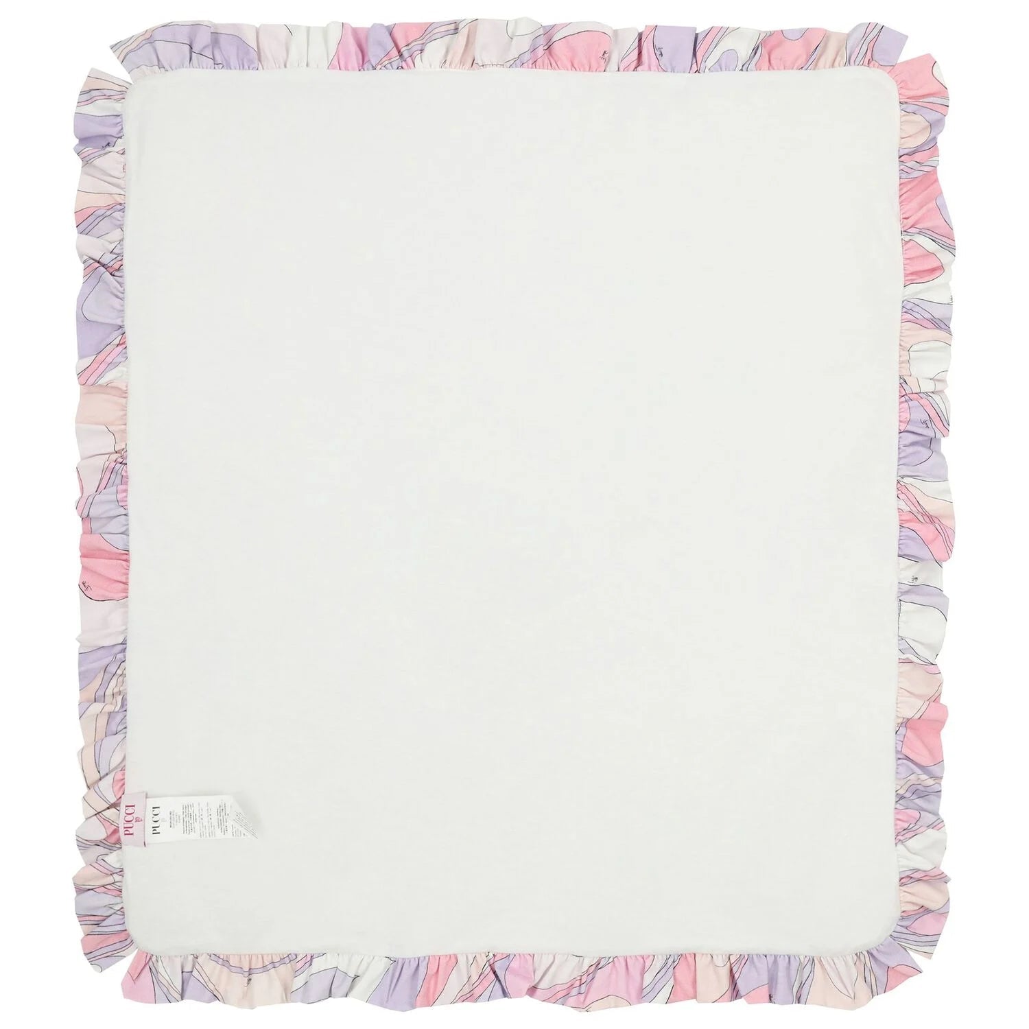White and pink blanket for baby girls by luxury Italian designer Pucci. Made from soft, padded cotton jersey, it features a playful embroidered fish motif on the front. The edges are finished with a ruffle decorated with the brand’s Iride print in pink and purple. Matching items are available to purchase separately.